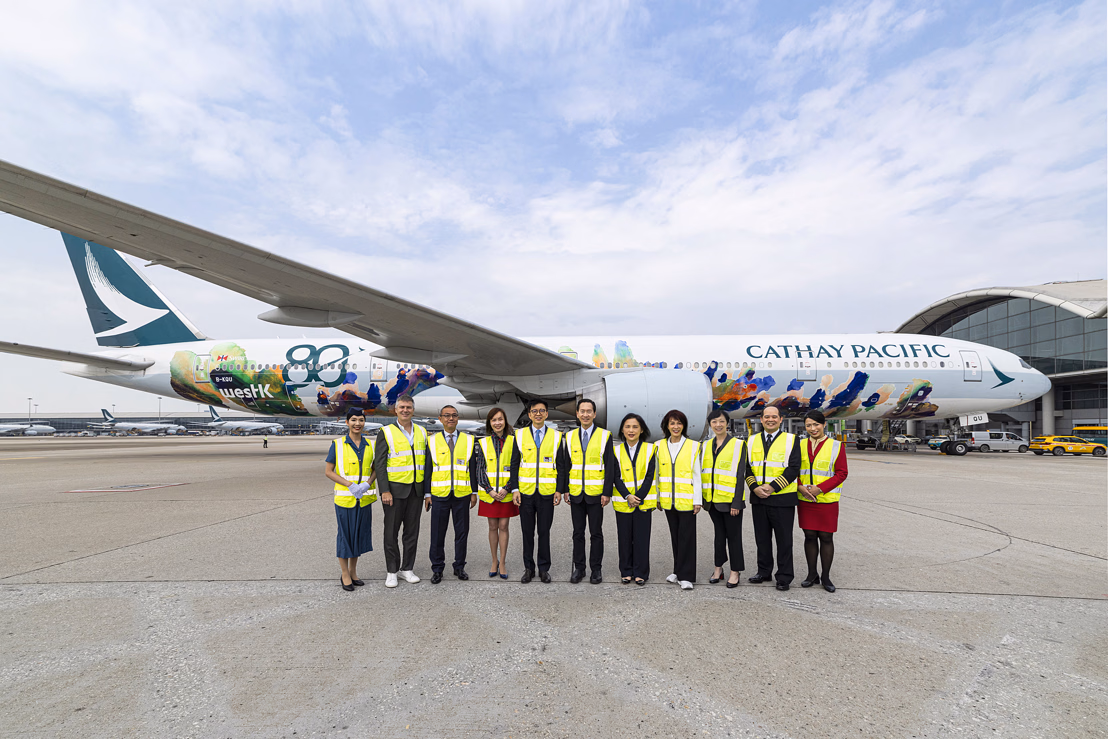 On Monday (March 9, 2026) Cathay Pacific and the West Kowloon Cultural District Authority (WKCDA) unveiled a striking new art-focused Boeing 777-300ER aircraft livery, ‘Spirit of Hong Kong – 80th Anniversary Edition.’ An unveiling ceremony for the new livery was held today at Hong Kong International Airport, officiated by Bernard Chan, Chairman of the Board, WKCDA; Ronald Lam, Chief Executive Officer, Cathay Group; Betty Fung, Chief Executive Officer, WKCDA; Lavinia Lau, Chief Customer and Commercial Officer, Cathay; and Joyce Ho, Deputy Chief Executive Officer (Corporate Development), WKCDA, and other distinguished guests.